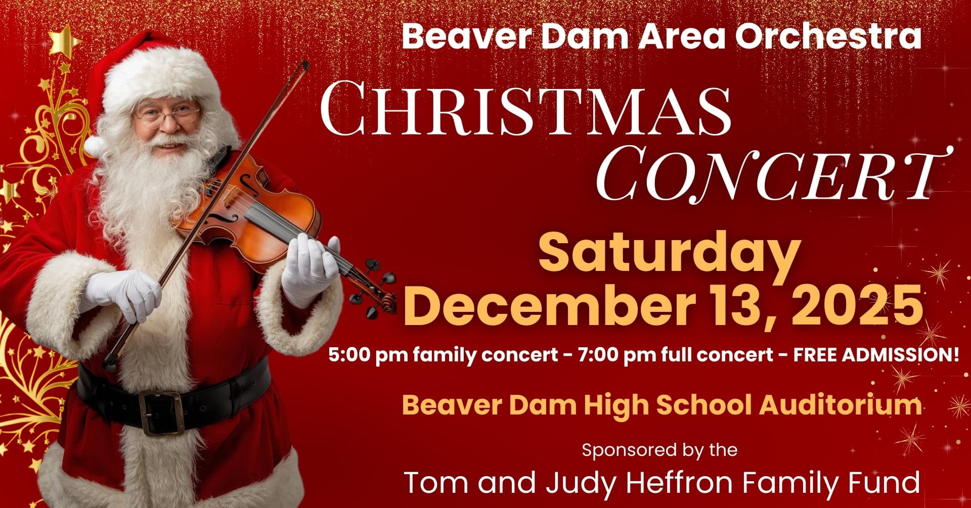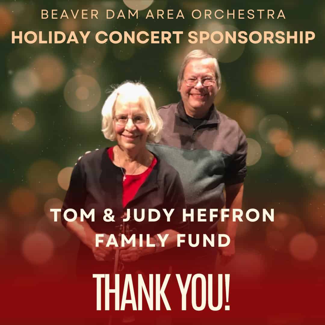 For over 25 years, Tom and Judy Heffron have been generously sponsoring the Beaver Dam Area Orchestra's annual holiday concert. Their support enables the orchestra to present this beloved community event free of charge, and they always delight audience members with a special gift. Thanks to their patronage, the holiday concert has grown in popularity, now featuring two performances. The Tom and Judy Heffron Family Fund is part of the Beaver Dam Area Community Foundation.